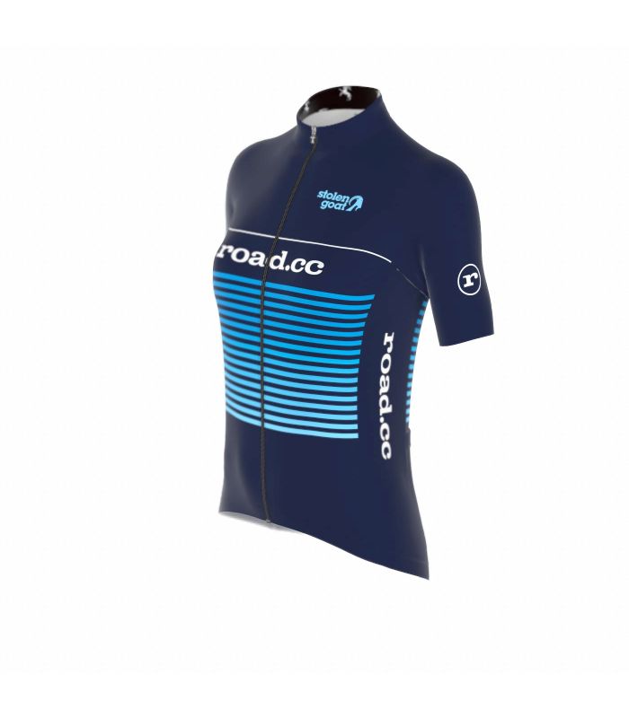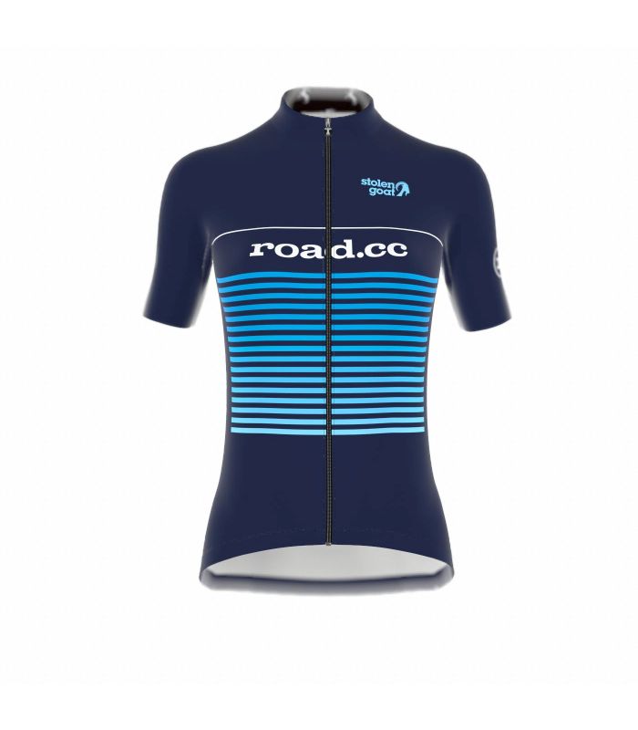 The Stolen Goat road.cc short sleeved bodyline jersey is the ultimate all-rounder for all kinds of adventures. Featuring theroad.cc logo and a stunning light blue striped design, on a classic navy background. This is a jersey that gives you the freedom to ride your way, and do it in style.